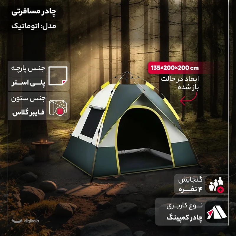 بسته بندی و جنس کار مناسب جهت حمل دستی و یا با وسیله نقلیه میباشد کاملا ضدآب و دارای ارتفاع سقفی ۱۳۵ از زمین میباشد . این مورد برای کسانی که میخواهند در طبیعت یا ارتفاعات استفاده کنن مناسب است میخ و بند برای فیکس کردن بر روی زمین در این محصول در نظر گرفته شده باز و بسته کردن این چادر به صورت اتوماتیک و تنها با خم کردن میله ها در ۱۵ الی ۲۰ ثانیه صورت میپذیرد این مدل شامل دو در همراه با پشه بند، و یک لایه در زیپی جهت پوشش دهی داخلی است این مدل مناسب جهت خوابیدن ۳ الی ۴ نفر میباشد. ابعاد محصول ۲۰۰ سلنتی متر در ۲۰۰سانتی متر در قسمت کف و ۱۴۵ سانتی متر ارتفاع از کف زمین میباشد .همچنین داری دو درب و دو پنجره است که پشت همه هرکدام تور کار شده است. لطفا هنگام خرید به ابعاد محصول توجه فرمایید . (در صورت نیاز به مشاوره در مورد محصول با شماره 09176305837 در ارتباط باشد.